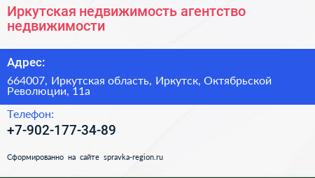 Иркутская недвижимость, агентство недвижимости по адресу 664007, Иркутская область, Иркутск, Октябрьской Революции, 11а в дальнейшем Организация, размещена в следующих категориях: