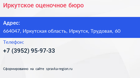 Иркутское оценочное бюро по адресу 664047, Иркутская область, Иркутск, Трудовая, 60 в дальнейшем Организация, размещена в следующих категориях: