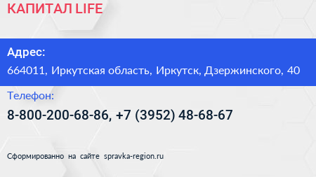 КАПИТАЛ LIFE по адресу 664011, Иркутская область, Иркутск, Дзержинского, 40 в дальнейшем Организация, размещена в следующих категориях: