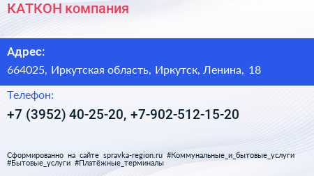 КАТКОН, компания по адресу 664025, Иркутская область, Иркутск, Ленина, 18 в дальнейшем Организация, размещена в следующих категориях: