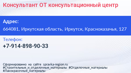 Консультант ОТ, консультационный центр по адресу 664081, Иркутская область, Иркутск, Красноказачья, 127 в дальнейшем Организация, размещена в следующих категориях:
