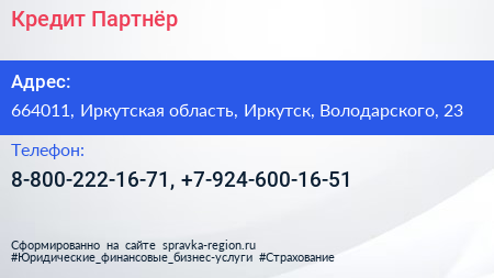 Кредит-Партнёр по адресу 664011, Иркутская область, Иркутск, Володарского, 23 в дальнейшем Организация, размещена в следующих категориях: