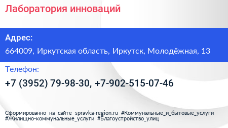 Лаборатория инноваций по адресу 664009, Иркутская область, Иркутск, Молодёжная, 13 в дальнейшем Организация, размещена в следующих категориях: