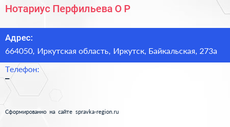 Нотариус Перфильева О.Р. по адресу 664050, Иркутская область, Иркутск, Байкальская, 273а в дальнейшем Организация, размещена в следующих категориях: