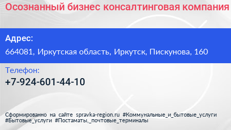 Осознанный бизнес, консалтинговая компания по адресу 664081, Иркутская область, Иркутск, Пискунова, 160 в дальнейшем Организация, размещена в следующих категориях: