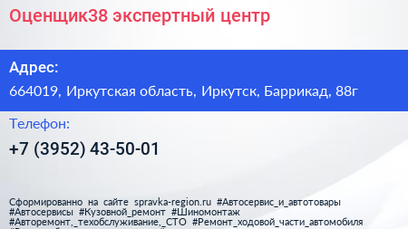 Оценщик38, экспертный центр по адресу 664019, Иркутская область, Иркутск, Баррикад, 88г в дальнейшем Организация, размещена в следующих категориях: