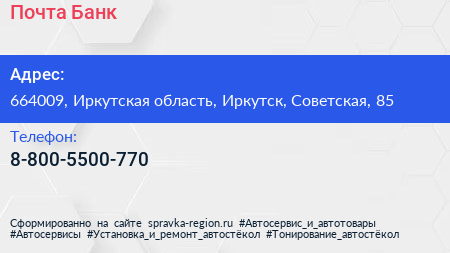 Почта Банк по адресу 664009, Иркутская область, Иркутск, Советская, 85 в дальнейшем Организация, размещена в следующих категориях: