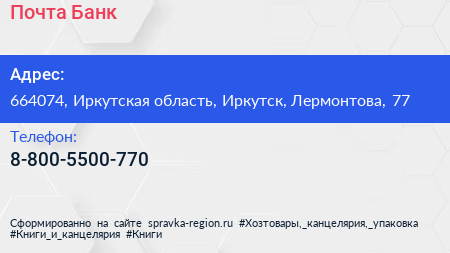 Почта Банк по адресу 664074, Иркутская область, Иркутск, Лермонтова, 77 в дальнейшем Организация, размещена в следующих категориях: