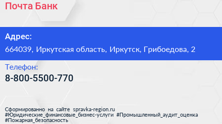 Почта Банк по адресу 664039, Иркутская область, Иркутск, Грибоедова, 2 в дальнейшем Организация, размещена в следующих категориях: