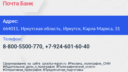 Почта Банк по адресу 664011, Иркутская область, Иркутск, Карла Маркса, 31 в дальнейшем Организация, размещена в следующих категориях: