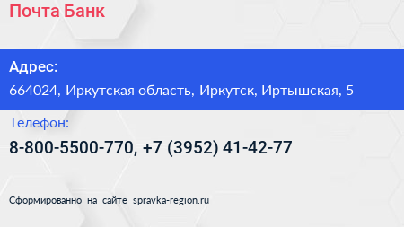 Почта Банк по адресу 664024, Иркутская область, Иркутск, Иртышская, 5 в дальнейшем Организация, размещена в следующих категориях: