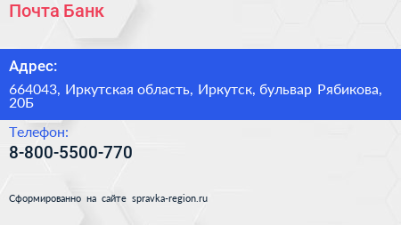 Почта Банк по адресу 664043, Иркутская область, Иркутск, бульвар Рябикова, 20Б в дальнейшем Организация, размещена в следующих категориях: