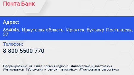 Почта Банк по адресу 664046, Иркутская область, Иркутск, бульвар Постышева, 37 в дальнейшем Организация, размещена в следующих категориях: