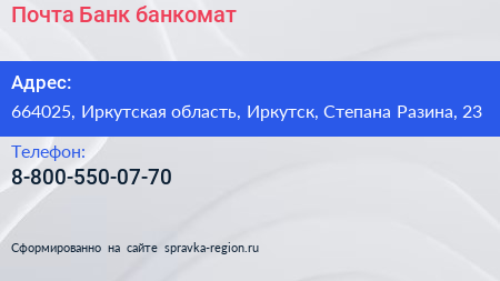 Почта Банк, банкомат по адресу 664025, Иркутская область, Иркутск, Степана Разина, 23 в дальнейшем Организация, размещена в следующих категориях:
