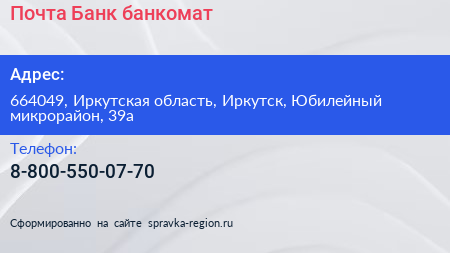 Почта Банк, банкомат по адресу 664049, Иркутская область, Иркутск, Юбилейный микрорайон, 39а в дальнейшем Организация, размещена в следующих категориях: