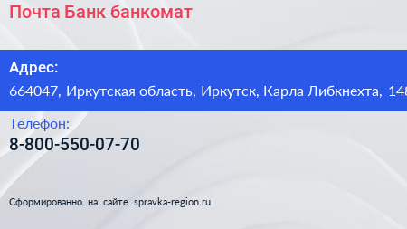 Почта Банк, банкомат по адресу 664047, Иркутская область, Иркутск, Карла Либкнехта, 148 в дальнейшем Организация, размещена в следующих категориях: