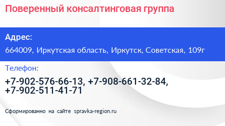 Поверенный, консалтинговая группа по адресу 664009, Иркутская область, Иркутск, Советская, 109г в дальнейшем Организация, размещена в следующих категориях: