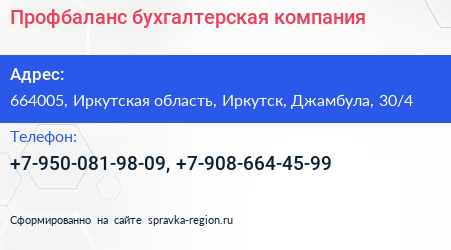 Профбаланс, бухгалтерская компания по адресу 664005, Иркутская область, Иркутск, Джамбула, 30/4 в дальнейшем Организация, размещена в следующих категориях: