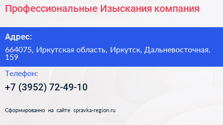 Профессиональные Изыскания, компания по адресу 664075, Иркутская область, Иркутск, Дальневосточная, 159 в дальнейшем Организация, размещена в следующих категориях: