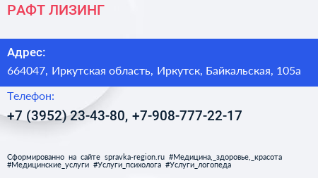 РАФТ ЛИЗИНГ по адресу 664047, Иркутская область, Иркутск, Байкальская, 105а в дальнейшем Организация, размещена в следующих категориях: