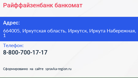 Райффайзенбанк, банкомат по адресу 664005, Иркутская область, Иркутск, Иркута Набережная, 1 в дальнейшем Организация, размещена в следующих категориях: