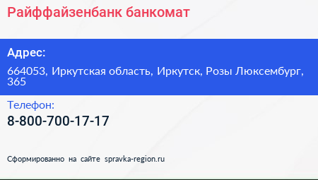 Райффайзенбанк, банкомат по адресу 664053, Иркутская область, Иркутск, Розы Люксембург, 365 в дальнейшем Организация, размещена в следующих категориях: