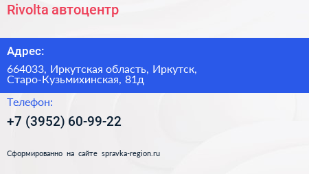 Rivolta, автоцентр по адресу 664033, Иркутская область, Иркутск, Старо-Кузьмихинская, 81д в дальнейшем Организация, размещена в следующих категориях: