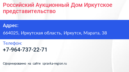 Российский Аукционный Дом, Иркутское представительство по адресу 664025, Иркутская область, Иркутск, Марата, 38 в дальнейшем Организация, размещена в следующих категориях: