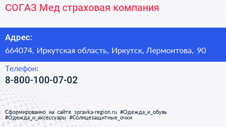 СОГАЗ-Мед, страховая компания по адресу 664074, Иркутская область, Иркутск, Лермонтова, 90 в дальнейшем Организация, размещена в следующих категориях: