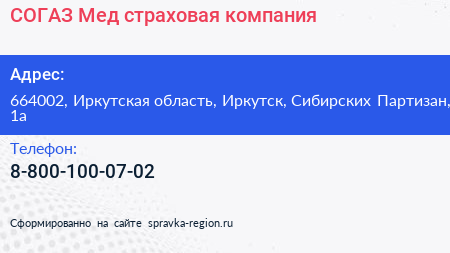 СОГАЗ-Мед, страховая компания по адресу 664002, Иркутская область, Иркутск, Сибирских Партизан, 1а в дальнейшем Организация, размещена в следующих категориях:
