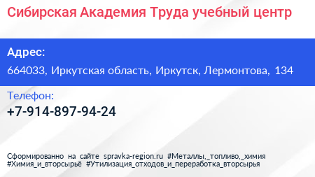 Сибирская Академия Труда, учебный центр по адресу 664033, Иркутская область, Иркутск, Лермонтова, 134 в дальнейшем Организация, размещена в следующих категориях: