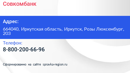 Совкомбанк по адресу 664040, Иркутская область, Иркутск, Розы Люксембург, 203 в дальнейшем Организация, размещена в следующих категориях:
