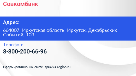 Совкомбанк по адресу 664007, Иркутская область, Иркутск, Декабрьских Событий, 103 в дальнейшем Организация, размещена в следующих категориях: