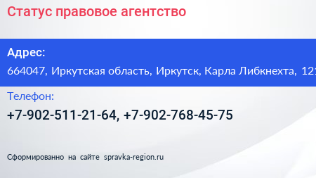 Статус, правовое агентство по адресу 664047, Иркутская область, Иркутск, Карла Либкнехта, 121 в дальнейшем Организация, размещена в следующих категориях: