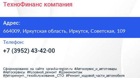 ТехноФинанс, компания по адресу 664009, Иркутская область, Иркутск, Советская, 109 в дальнейшем Организация, размещена в следующих категориях: