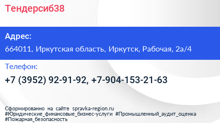 Тендерсиб38 по адресу 664011, Иркутская область, Иркутск, Рабочая, 2а/4 в дальнейшем Организация, размещена в следующих категориях:
