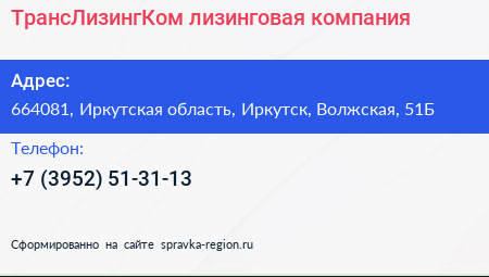 ТрансЛизингКом, лизинговая компания по адресу 664081, Иркутская область, Иркутск, Волжская, 51Б в дальнейшем Организация, размещена в следующих категориях: