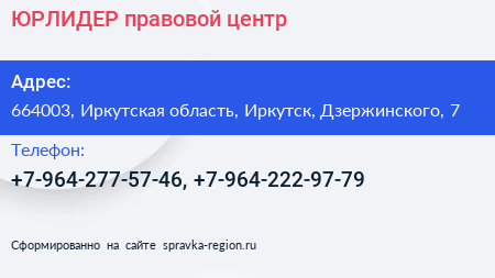 ЮРЛИДЕР, правовой центр по адресу 664003, Иркутская область, Иркутск, Дзержинского, 7 в дальнейшем Организация, размещена в следующих категориях: