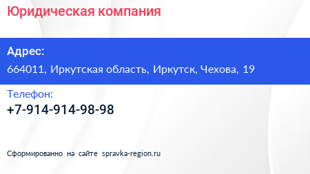 Юридическая компания по адресу 664011, Иркутская область, Иркутск, Чехова, 19 в дальнейшем Организация, размещена в следующих категориях:
