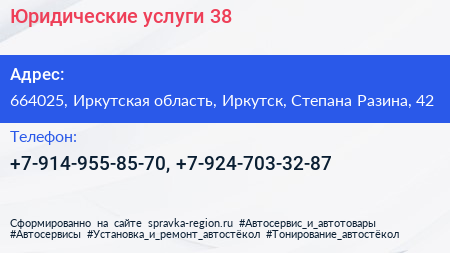 Юридические услуги 38 по адресу 664025, Иркутская область, Иркутск, Степана Разина, 42 в дальнейшем Организация, размещена в следующих категориях: