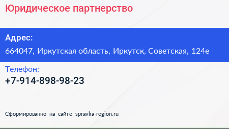Юридическое партнерство по адресу 664047, Иркутская область, Иркутск, Советская, 124е в дальнейшем Организация, размещена в следующих категориях: