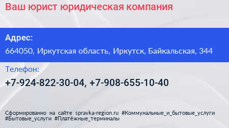 Ваш юрист, юридическая компания по адресу 664050, Иркутская область, Иркутск, Байкальская, 344 в дальнейшем Организация, размещена в следующих категориях: