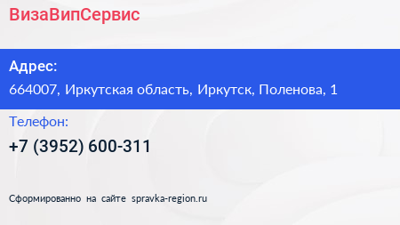 ВизаВипСервис по адресу 664007, Иркутская область, Иркутск, Поленова, 1 в дальнейшем Организация, размещена в следующих категориях: