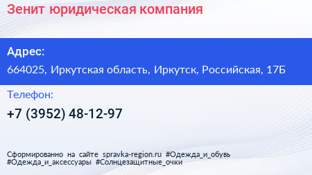 Зенит, юридическая компания по адресу 664025, Иркутская область, Иркутск, Российская, 17Б в дальнейшем Организация, размещена в следующих категориях: