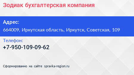 Зодиак, бухгалтерская компания по адресу 664009, Иркутская область, Иркутск, Советская, 109 в дальнейшем Организация, размещена в следующих категориях: