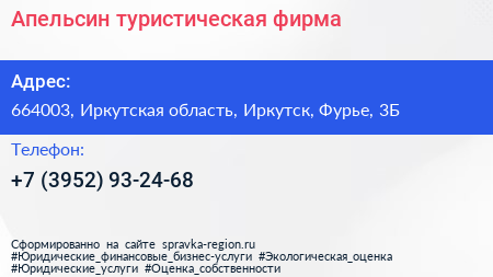 Апельсин, туристическая фирма по адресу 664003, Иркутская область, Иркутск, Фурье, 3Б в дальнейшем Организация, размещена в следующих категориях: