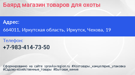 Баярд, магазин товаров для охоты по адресу 664011, Иркутская область, Иркутск, Чехова, 19 в дальнейшем Организация, размещена в следующих категориях: