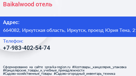 Baikalwood, отель по адресу 664082, Иркутская область, Иркутск, проезд Юрия Тена, 21 в дальнейшем Организация, размещена в следующих категориях: