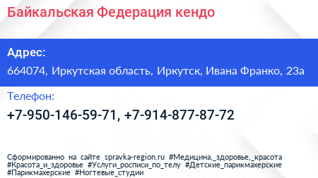Байкальская Федерация кендо по адресу 664074, Иркутская область, Иркутск, Ивана Франко, 23а в дальнейшем Организация, размещена в следующих категориях: