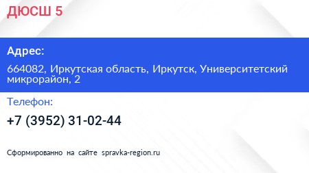 ДЮСШ №5 по адресу 664082, Иркутская область, Иркутск, Университетский микрорайон, 2 в дальнейшем Организация, размещена в следующих категориях: